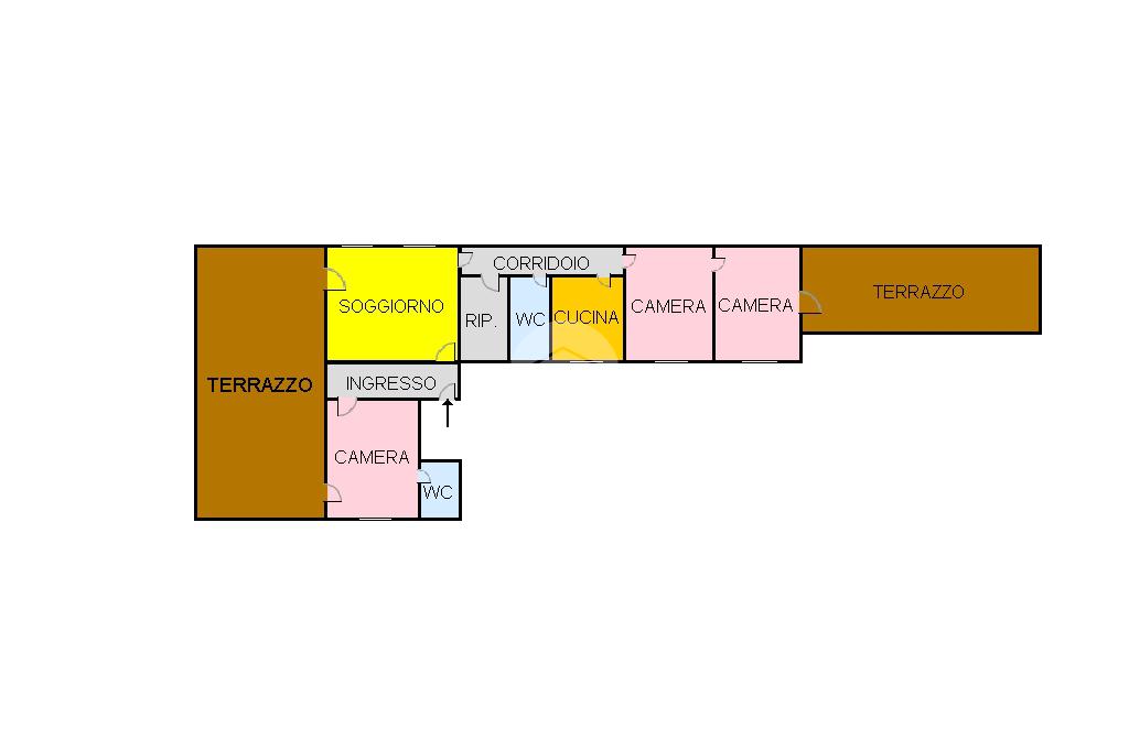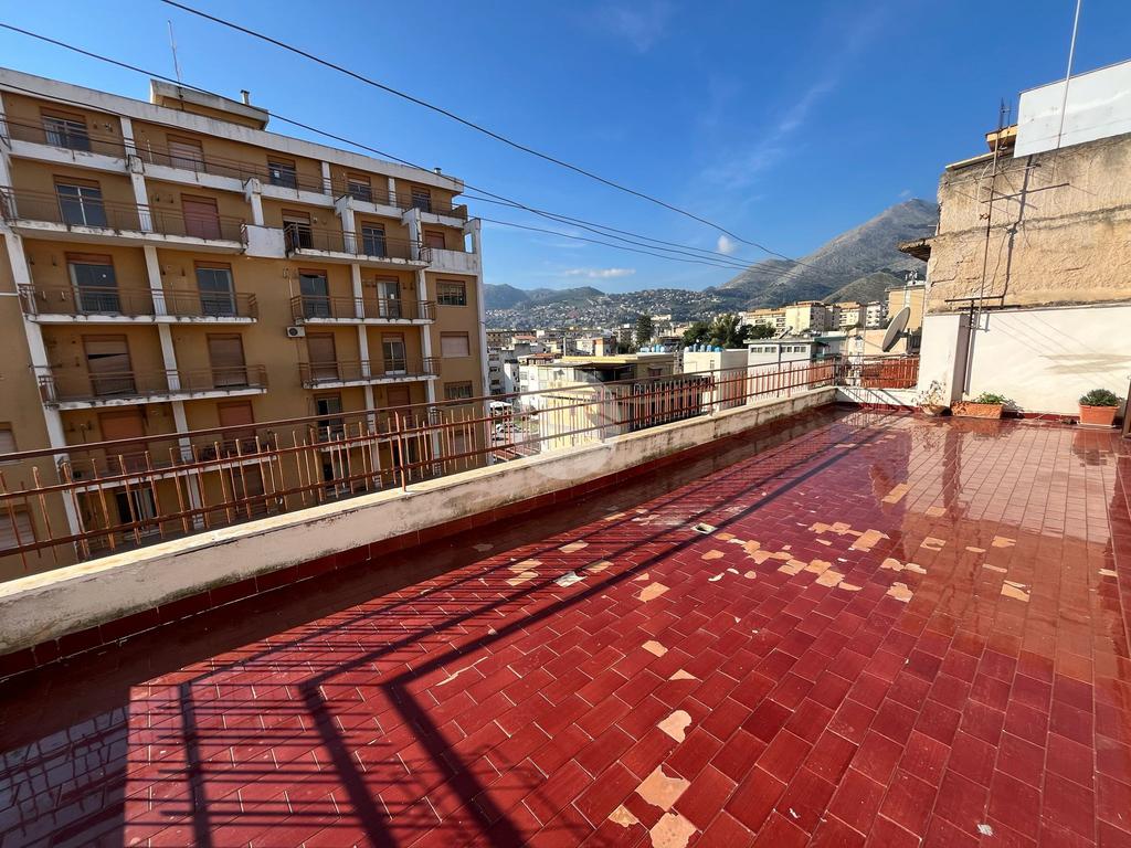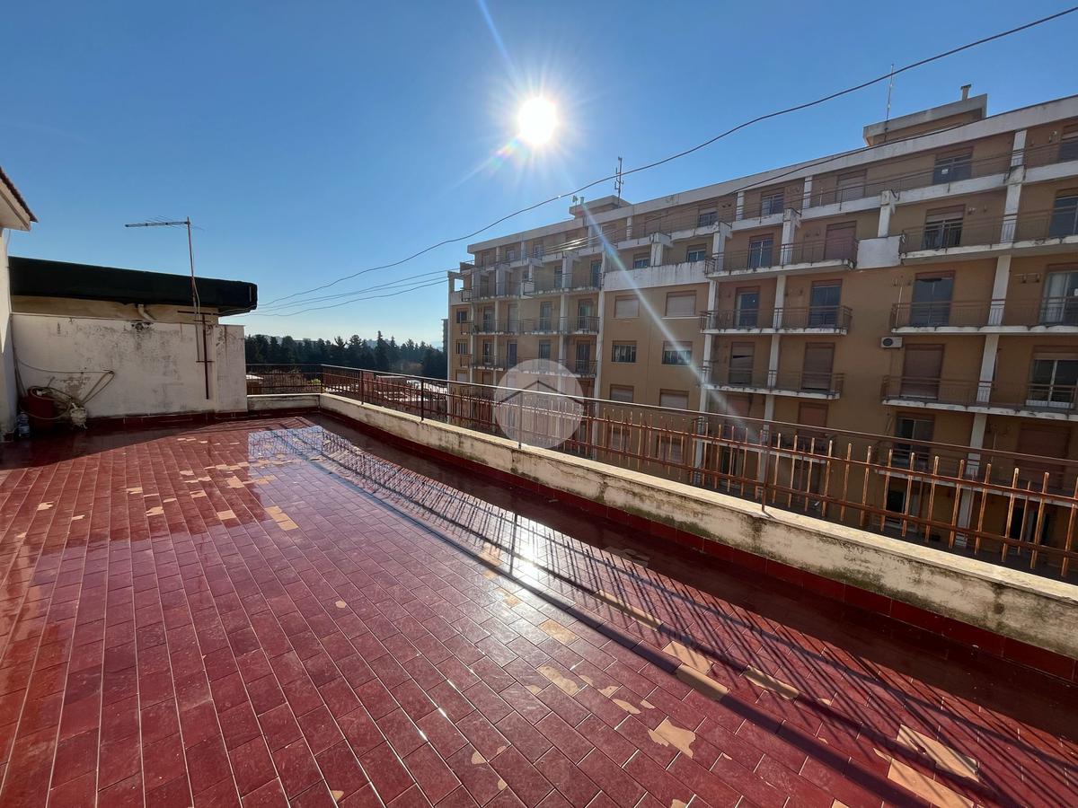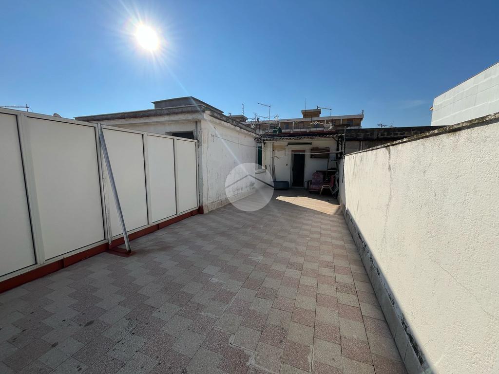 L'interno dell'appartamento è composto da un ingresso con disimpegno, un soggiorno e una camera da letto con accesso al terrazzo principale di 44 mq, cucina non abitabile con cucinotto, servizio finestrato con vasca, un ripostiglio e altre due camere da letto, una delle quali con accesso al secondo terrazzo di 40 mq.